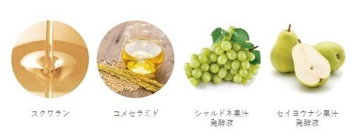 植物エンドルフィン(セイヨウニンジンボク果実エキス)、スクワラン、コメセラミド、シャルドネ果汁発酵液、セイヨウナシ果汁発酵液、バチルス発酵物、発酵イチジクエキス、水溶性コラーゲン、ダマスクローズハチミツ、ローズオットー*(ダマスクバラ花油)、ゼラニウム*(ニオイテンジクアオイ油)、フランキンセンス(ニュウコウジュ油)